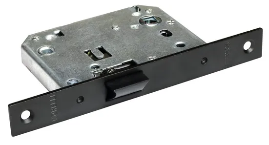 Сантехническая защелка с пластиковым язычком. Используется для бесшумного запирания дверей в сантехнические помещения. Межосевое расстояние 70мм.
